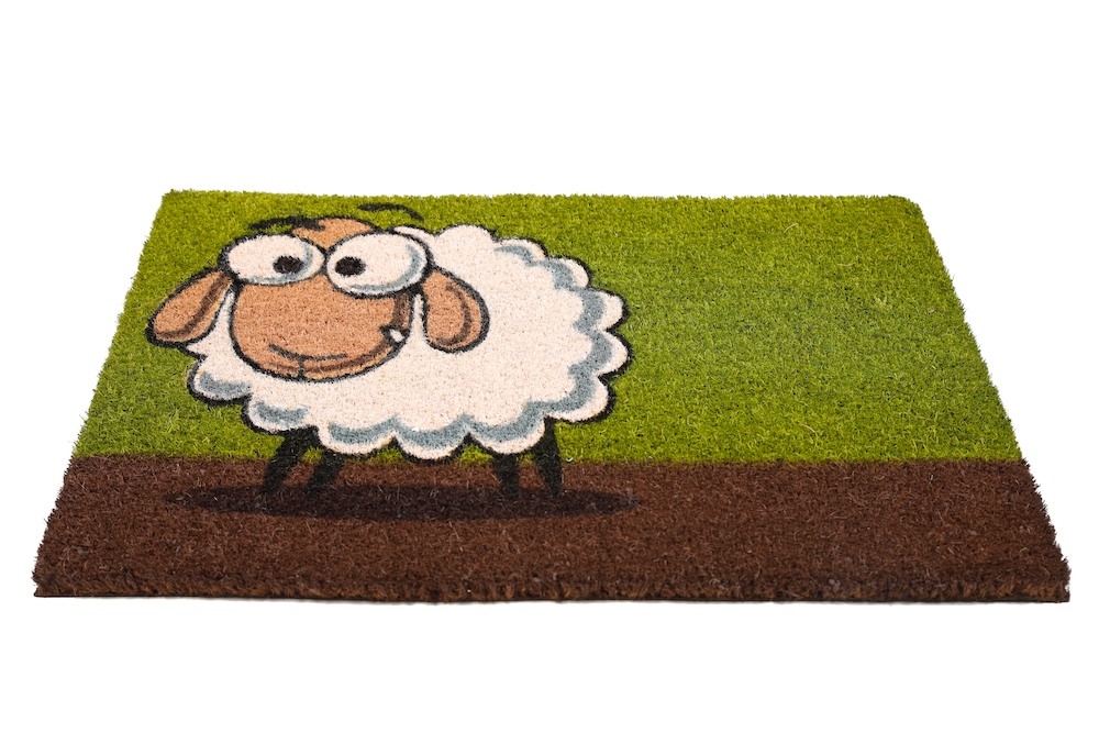 Paillasson personnalisé conçu en coco, visuel mouton sur fond vert et marron, à rapporter sur le sol
