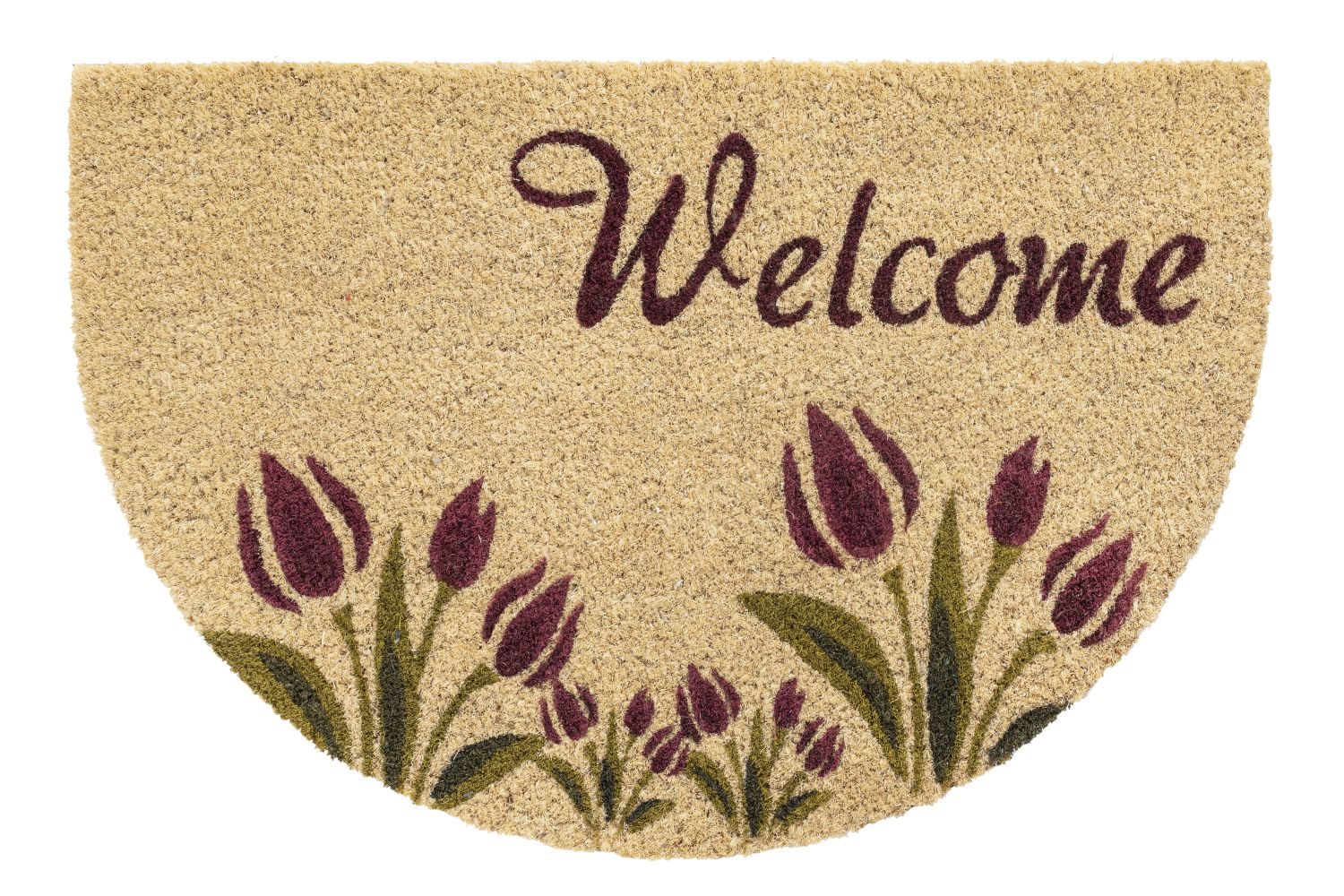 Paillasson personnalisé conçu en coco, inscription welcome, visuel tulipes sur fond beige, à rapporter sur le sol