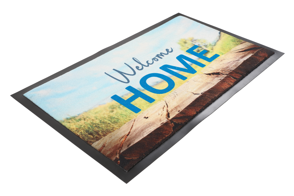 Tapis personnalisé conçu en polyamide, inscription welcome home, à rapporter sur le sol