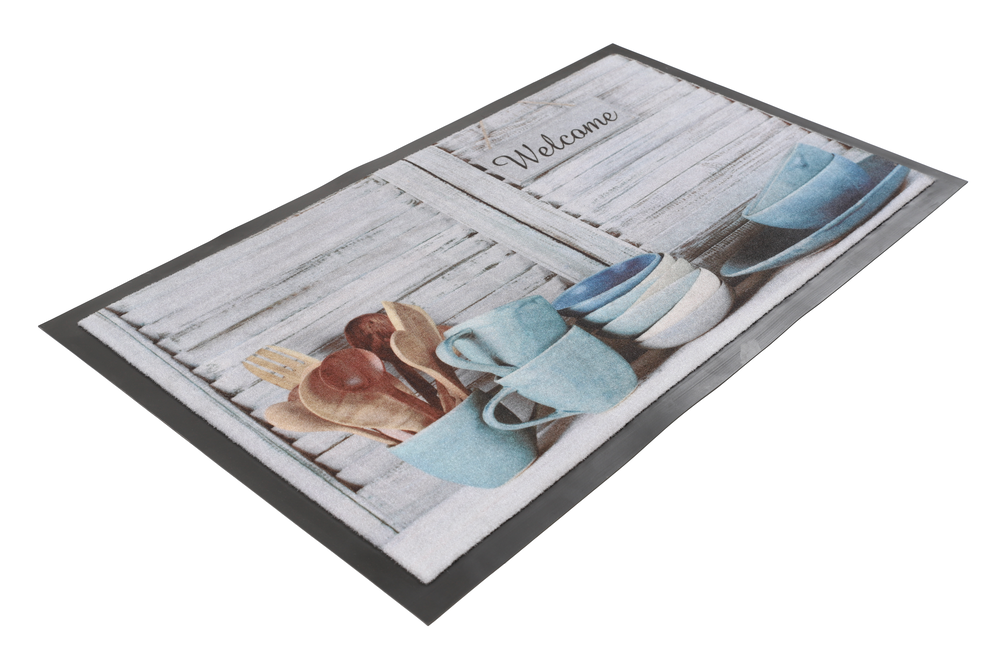Tapis personnalisé conçu en polyamide, inscription welcome, visuel vaisselle, à rapporter sur le sol