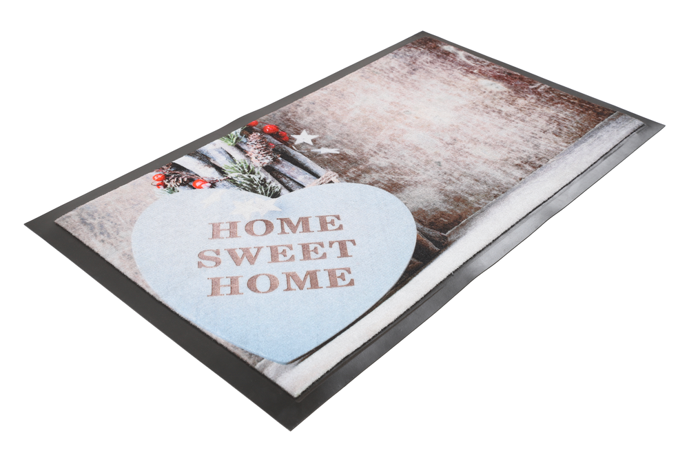 Tapis personnalisé conçu en polyamide, inscription home sweet home, visuel coeur, à rapporter sur le sol